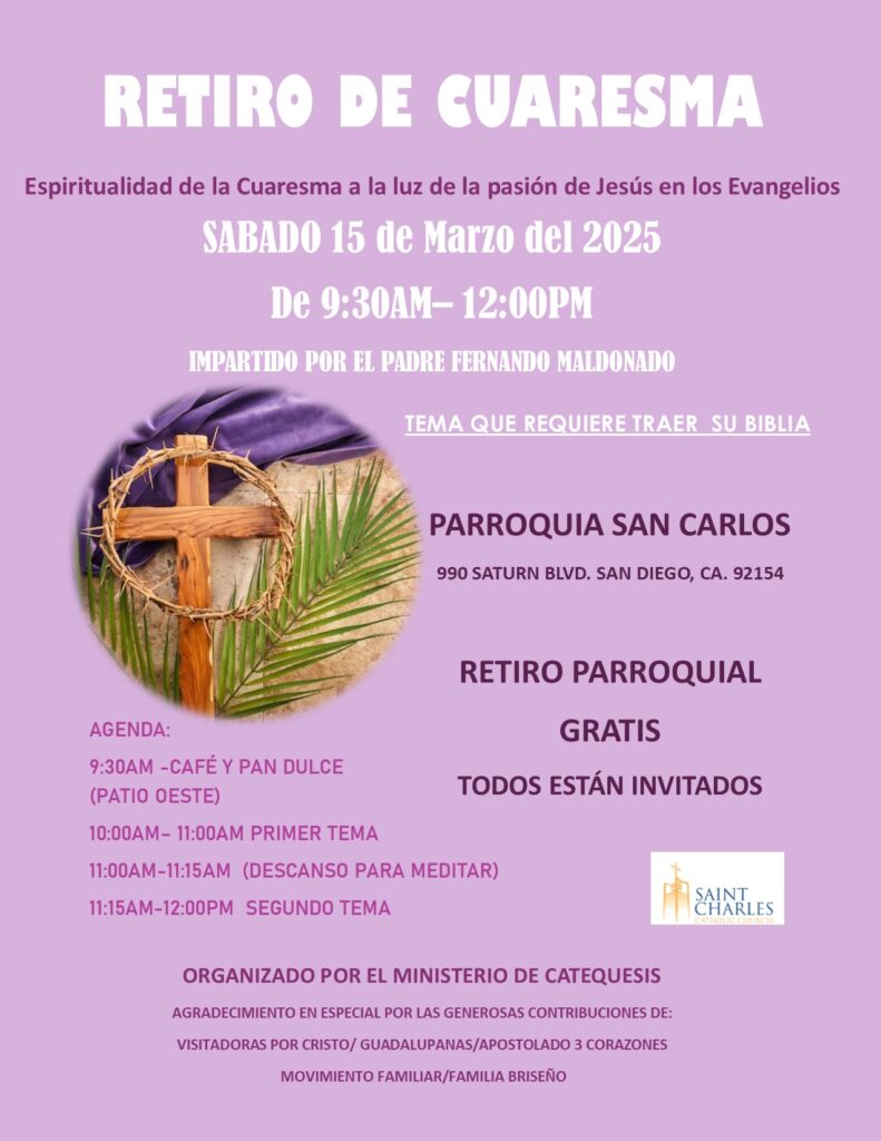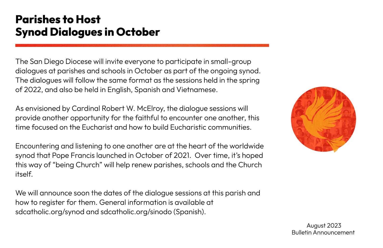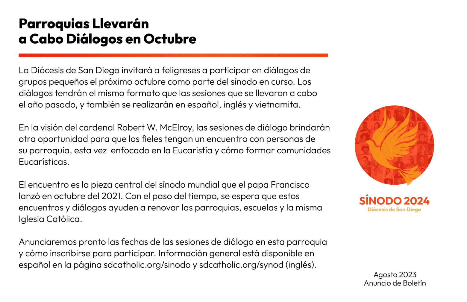 Por lo tanto, lo invito a considerar en oración su respuesta, tomando en cuenta los dones que Dios le ha concedido. Puede escribir la cantidad a la que se compromete en la tarjeta de respuesta que viene adjunta y devolverla en la colecta del fin de semana, en la oficina parroquial o enviarla por correo a la oficina. Para obtener más información o para hacer un compromiso o una donación segura en línea visite la página sdcatholic.org/giving y escoja Annual Catholic Appeal. También puede hacer un regalo a través de una donación de acciones o IRA en sdcatholic.org/giving/stock-donations. Si en este momento le es imposible hacer una donación, le pedimos que ore por una exitosa colecta anual para nuestra parroquia.
