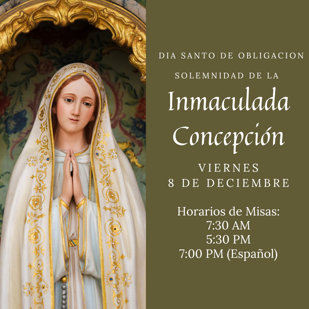 MASS SCHEDULEWEEKDAYS:Monday-Friday 7:30 AM & 5:30 PMSaturday8:00 AMSUNDAY MASSSaturday 5PM Vigil MassSunday: 7:00 AM, 8:30 AM,10:00 AM, 11:30 AM (Spanish),1:00 PMFor Holy Days: Check bulletin scheduleVisit: CatholicMassTime.org |