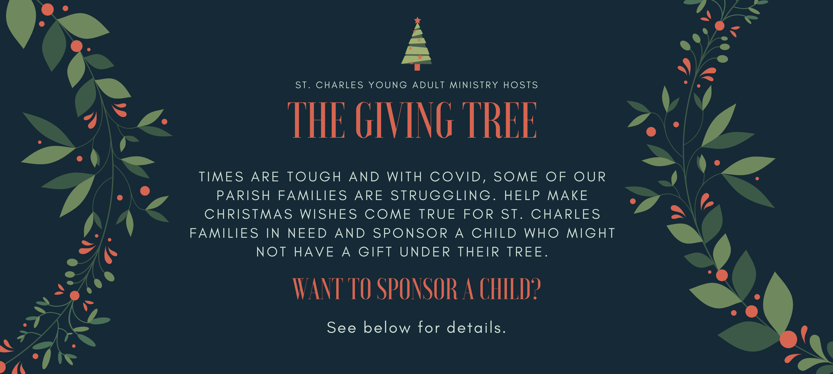 It's that time of the year again! The Young Adult Ministry is hosting The Giving Tree! Help make Christmas wishes come true for St. Charles' families in need and Sponsor a child who might not have a gift under their tree this year. If you would like to Sponsor a child, the St. Charles YAM Angels will do the shopping for you. You can make a Donation in the collection basket (in an envelope labeled: Giving Tree) at Sunday Mass or dropped off at rhe Parish Office by Wednesday, December 20, 2023. You can also make your donation here. (On the Donate site, under "Donations/Others" please type in "The Giving Tree.")